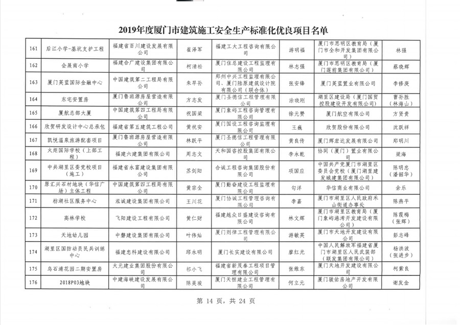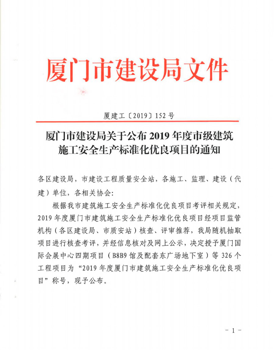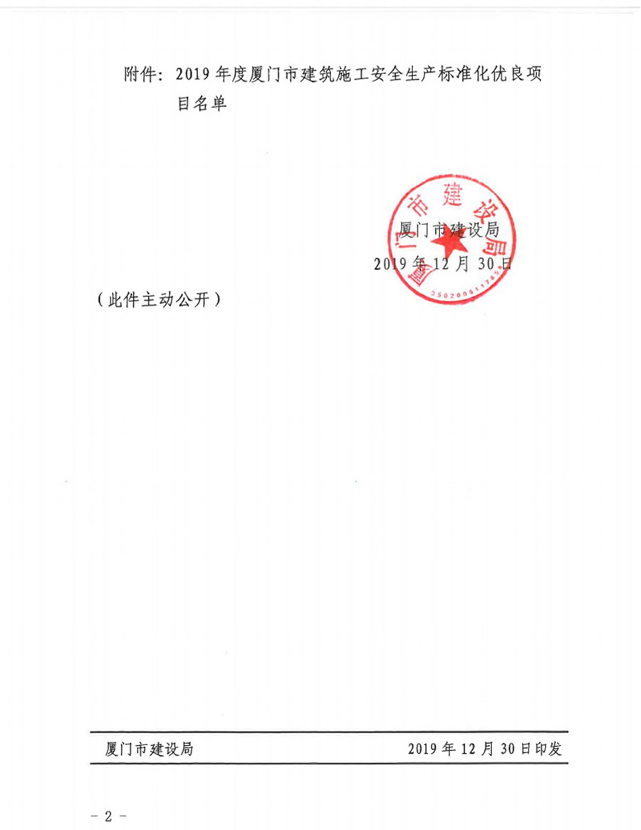廈門市建設(shè)局關(guān)于公布2019年度市級(jí)建筑施工安全生產(chǎn)標(biāo)準(zhǔn)化優(yōu)良項(xiàng)目的通知